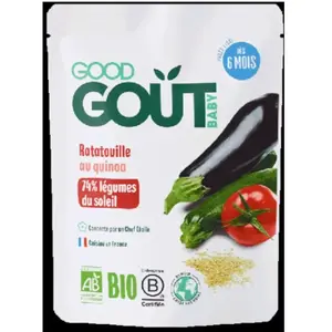 Plante sacrée des Incas qui la surnommaient \mère de tous les grains\", le quinoa est cultivé depuis plus de 6000 ans sur les hauts plateaux des Andes de l'Amérique du Sud. La légende dit que l'empereur inca semait les premières graines avec un outil en or. Redécouvert récemment, il est aujourd'hui considéré comme une céréale à grande valeur nutritionnelle, très facile à digérer.La ratatouille au quinoa de Good Goût, c'est un peu notre méli-mélo de Super Légumes, notre ligue des saveurs exceptionnelles. Jugez plutôt : des courgettes, des aubergines, des tomates, des oignons. Sans oublier du savoureux quinoa pour une texture croquante. Une chouette recette pour végétariens hors du commun, en somme.Parce que dans notre ratatouille, il y a de la courgette, de l'aubergine, de la pulpe de tomate, de l'eau de cuisson, de l'oignon, du quinoa, de l'huile d'olive. Et c'est tout ! De là à dire qu'elle concurrence la recette de votre mamie... Parce que dans notre ratatouille, il n'y a que des légumes bio. Si nous les avons choisis bio, c'est pour garantir à votre enfant des produits sains et bons pour la planète : aucun de nos légumes n'a ainsi été maltraité par des OGM, pesticides, engrais chimiques pendant sa culture. Parce que conformément à la réglementation, notre sachet souple ne contient ni bisphénol A, ni phtalates. Et surtout parce qu'il nécessite une stérilisation des ingrédients beaucoup moins longue que celle des petits pots : à l'arrivée, c'est autant de saveurs préservées !"