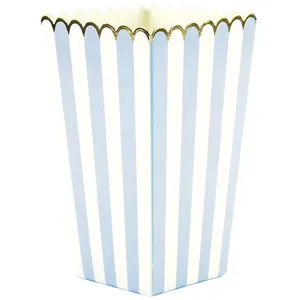 Lot de 8 boites à pop-corn rayées bleu et bleu bébé avec liseré doré. Idéal pour un anniversaire enfant sur le thème pirate ou une baby shower. Pensez également aux assiettes gobelets serviettes et décorations sur le même thème.