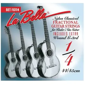 Labella FG114 - Jeu de cordes guitare classique 1/4 FractionalJeu pour guitare classique FRACTIONAL, aigus nylon, basses filées plaqué argent, taille 1/4 (longueur vibrante 44/45 cm). En-tête / Fabricant=Labella;Type de Produit=Cordes guitare;Titre=Labella FG114 - Jeu de cordes guitare classique 1/4 Fractional