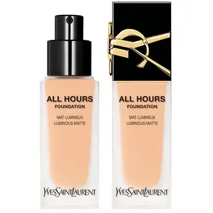 De ALL HOURS FOUNDATION van Yves Saint Laurent Beauty zorgt 24 uur lang voor een matte finish. De huid voelt comfortabel en vlekkeloos aan. De waterproof en olievrije formule is bijzonder zacht en smelt gemakkelijk op de huid. De matte foundation dekt glans betrouwbaar en langdurig af en laat de huid stralen. Dankzij de vele fijngemalen pigmenten geeft de vloeibare foundation met hoge dekking een geperfectioneerde teint zonder maskereffect. Hij vlekt niet en nestelt zich niet op rimpels of oneffenheden. Vind je perfecte tint in de verschillende tinten van ALL HOURS FOUNDATION van YSL Beauty en benadruk je individuele schoonheid! De luxe foundation geeft je altijd een perfect matte uitstraling. Breng een paar druppels ALL HOURS FOUNDATION van Yves Saint Laurent Beauty aan op de rug van je hand. Gebruik een make-upkwast of je vingers om de foundation uit te smeren. Dep de foundation op je voorhoofd, wangen, neus en kin. Vervaag de matte foundation vervolgens vanuit het midden van het gezicht naar buiten toe. Je moet de luxe foundation zorgvuldig mengen, vooral op de hals, oren en haarlijn. - Volledige dekking tot 24 uur lang - Lichtgewicht en comfortabel om te dragen - Met hyaluronzuur Opmerking: Nieuw artikelontwerp - product blijft ongewijzigd.