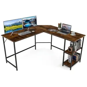 COSTWAY Bureau dAngle Informatique en Forme L 138 CM Industriel avec Structure en Acier au Carbone Étagère à 2 Niveaux Marron