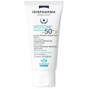 Isispharma Neotone Radiance SPF50+ Fluide Intensif Protecteur Teinté Clair 30mlRéduisez de façon visible vos taches brunes et protégez votre peau grâce au soin de jour Neotone® Radiance SPF 50+ ! Le saviez-vous ? Les rayons UV et la lumière bleue sont les premiers facteurs responsables de l'apparition de taches brunes sur la peau. NEOTONE® Radiance SPF 50+, spécialement développé pour corriger tous les types de taches et prévenir leur apparition, offre une très haute protection associée à une action anti-tache efficace ! Grâce à sa combinaison d’actifs optimale, c’est un vrai bouclier protecteur pour votre peau contre les rayonnements responsables de l’apparition des taches pigmentaires.Adaptée aux peaux sensibles, sa formule composée du complexe DEPI- ACT®, agit à chaque étape de la formation des taches et contient des actifs protecteurs. NEOTONE® Radiance SPF 50+ offre ainsi une protection complète contre les UVA, UVB, la lumière bleue et la pollution tout en réduisant efficacement les taches brunes :- La mélanine fractionnée qui protège des effets néfastes de la lumière bleue - Un actif anti-pollution pour prévenir le stress oxydatif et protéger des agressions extérieures- Une combinaison de filtres solaires optimale avec une très haute protection UVA (67) et UVB (73), l’une des plus performante du marchéSon efficacité a été cliniquement prouvée :- Une efficacité équivalente à la molécule médicale de référence dans le traitement de l’hyperpigmentation*- Une diminution des taches jusqu’à -43%* - Une tolérance optimale pour 100% des sujets *- Une amélioration significative de la qualité de vie des patients*Conseils d’utilisation : Appliquez tous les matins sur l’intégralité du visage le décolleté, et mains. Pour une efficacité optimale, il est recommandé de l’utiliser en association avec le soin de nuit NEOTONE® Serum ou NEOTONE® Sensitive. Pour un teint unifié et éclatant !En cas d’exposition prolongée au soleil, r...