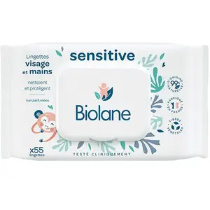 Biolane Bain et Toilette Lingette Sensitive Visage et Mains 55 unitéss sont des lingettes visage et mains \sensitive\" qui sont idéales pour débarbouiller votre bébé après chaque repas et goûter. Elles nettoient tout en laissant une peau apaisée, hydratée et protégée. Notre vocation : protéger la peau sensible de votre bébé. Des lingettes 99% d'ingrédients d'origine naturelle, pour une peau propre et délicatement parfumée. Une formule testée cliniquement sous contrôle médical pour la plus grande sécurité des bébés. Fabriqué en France. "