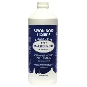 Savon noir liquide MARIUS FABRE à base dhuile dolive. - Quantité : bouteille de 1 L. Le savon noir est idéal pour nettoyer efficacement sans polluer.