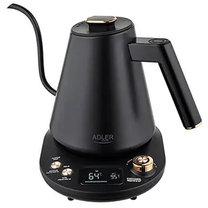 Prise UE.Découvrez un nouveau niveau de commodité et de sophistication dans votre cuisine avec la bouilloire électrique Adler AD 1349.Cette bouilloire élégante d´une capacité de 1.0 litre offre une gamme de fonctionnalités innovantes qui satisferont même les utilisateurs les plus exigeants.L´Adler AD 1349 n´est pas seulement une bouilloire électrique, c´est un outil de cuisine avancé qui allie fonctionnalité et design élégant.Avec une large gamme de réglages de température et des fonctionnalités innovantes, cette bouilloire répondra aux besoins de chaque utilisateur, offrant à la fois sécurité et commodité.L´AD 1349.- La bouilloire à col de cygne est la solution idéale pour les amateurs de café qui apprécient la précision et le contrôle du processus d´infusion.Équipée de la fonction de chauffage précis de l´eau à des températures spécifiques : 91°C, 93°C ou 96°C, elle vous permet d´ajuster parfaitement la température aux différentes méthodes d´infusion du café.La fonction de chauffage précis de l´eau a été spécialement conçue pour l´infusion de grains de café moulus.Grâce à la possibilité de choisir l´une des trois températures, vous pouvez contrôler précisément le processus d´extraction, ce qui vous permet d´obtenir le meilleur goût et arôme de chaque tasse de café.Caractéristiques :- Contrôle de la température : Contrôle précis de la température pour faire bouillir l´eau dans une plage de 40°C à 100°C (incréments de 5°C), vous permettant de préparer diverses boissons en fonction de leurs besoins spécifiques en température.- Capacité : Une capacité maximale de 1.0 litre et un minimum de 0.2 litre offrent une utilisation flexible, des petites quantités d´eau aux grands volumes.- Élément chauffant plat : Fabriqué en acier inoxydable de haute qualité, l´élément chauffant plat assure une ébullition rapide et efficace.- Sécurité : La bouilloire est équipée d´une protection contre l´ébullition à sec, d´un arrêt automatique et d´un signal sonore au démarrage et après l´éb...