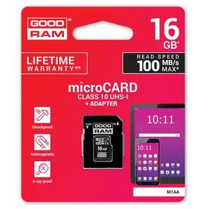 Goodram M1AA-0160R12 - 16 Go - MicroSDHC - classe 10 - UHS-I - 100 Mo/s - 10 Mo/s (16 Go, microSDHC, U1, UHS-I), Carte mémoire, Noir