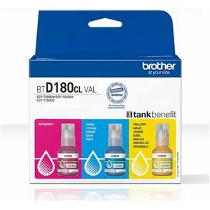 Bouteille d'encre Brother BTD-180CLVAL, autonomie allant jusqu'à 7 500 pages en noir et blanc et jusqu'à 5 000 pages en couleur. Couleurs : Noir, Cyan, Magenta, Jaune. Facilité d'utilisation. Obtenez toujours des impressions éclatantes pour une impression sans souci avec des coûts d'impression réduits.