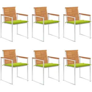Ces chaises de jardin en bois sont conçues pour devenir le point de mire de votre jardin ou de votre patio. Les chaises de salle à manger sont fabriquées en bois d'acacia massif et en acier inoxydable de haute qualité, ce qui les rend très durables, résistantes à la rouille, robustes et faciles à nettoyer avec un chiffon humide. Le coussin inclus est plus qu'un supplément pratique, il a également une fonction décorative. Asseyez-vous pour un délicieux dîner en plein air ou détendez-vous et profitez du beau temps avec cet ensemble classique de chaises de jardin. Remarque : afin de prolonger la durée de vie de vos meubles d'extérieur, nous vous recommandons de les nettoyer régulièrement et de ne pas les laisser à l'extérieur sans protection inutilement.Nettoyage : Utiliser une solution savonneuse douce.Stockage : si possible, stockez dans un endroit frais et sec à l'intérieur. Si le produit est stocké à l'extérieur, protégez-le avec une housse imperméable. Essuyez et séchez l'excès d'eau ou de neige des surfaces planes après la pluie ou une chute de neige. Permettez une circulation d'air suffisante afin d'éviter les dommages liés à l'humidité. Couleur du coussin : vert vif Matériau : bois d'acacia massif avec une finition à l'huile d'aspect de teck, acier inoxydable 304 Matériau du coussin : tissu (100 % polyester) Dimensions : 60 x 56 x 85 cm (l x P x H) Profondeur du siège : 46 cm Hauteur du siège : 45 cm Hauteur des accoudoirs à partir du sol : 65,5 cm Épaisseur du coussin : 3 cm Empilable Résistance aux intempéries et à la rouille L'assemblage est requis La livraison contient : 6 x chaise 6 x coussin