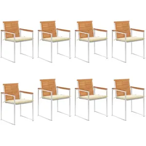 Ces chaises de jardin en bois sont conçues pour devenir le point de mire de votre jardin ou de votre patio. Les chaises de salle à manger sont fabriquées en bois d'acacia massif et en acier inoxydable de haute qualité, ce qui les rend très durables, résistantes à la rouille, robustes et faciles à nettoyer avec un chiffon humide. Le coussin inclus est plus qu'un supplément pratique, il a également une fonction décorative. Asseyez-vous pour un délicieux dîner en plein air ou détendez-vous et profitez du beau temps avec cet ensemble classique de chaises de jardin. Remarque : afin de prolonger la durée de vie de vos meubles d'extérieur, nous vous recommandons de les nettoyer régulièrement et de ne pas les laisser à l'extérieur sans protection inutilement.Nettoyage : Utiliser une solution savonneuse douce.Stockage : si possible, stockez dans un endroit frais et sec à l'intérieur. Si le produit est stocké à l'extérieur, protégez-le avec une housse imperméable. Essuyez et séchez l'excès d'eau ou de neige des surfaces planes après la pluie ou une chute de neige. Permettez une circulation d'air suffisante afin d'éviter les dommages liés à l'humidité. Couleur du coussin : Crème Matériau : bois d'acacia massif avec une finition à l'huile d'aspect de teck, acier inoxydable 304 Matériau du coussin : tissu (100 % polyester) Dimensions : 60 x 56 x 85 cm (l x P x H) Profondeur du siège : 46 cm Hauteur du siège : 45 cm Hauteur des accoudoirs à partir du sol : 65,5 cm Épaisseur du coussin : 3 cm Empilable Résistance aux intempéries et à la rouille L'assemblage est requis La livraison contient : 8 x chaise 8 x coussin
