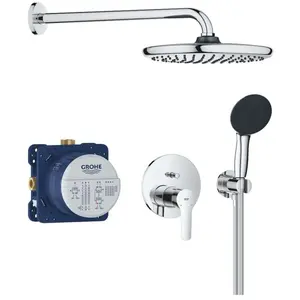 Composé de : Mitigeur monocommande encastré avec inverseur 2 voies Grohe Rapido SmartBox boîte d'encastrement universelle 1/2" (35 600) Vitalio Start 250 Set de douche de tête 9.5 l/min bras de douche horizontal inclus Vitalio Start 110 Douchette à main 2 jets 9.5 l/min (27 946) Coude de raccordement mural 1/2" avec support Flexible de douche VitalioFlex Comfort 1.500 mm (28 743).
