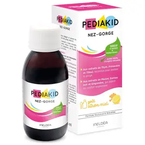 Description : Pediakid nez gorge est un complément alimentaire sous forme de sirop qui renferme notamment :- des extraits de Tilleul, de Mauve, et de Gingembre qui aident au confort respiratoire.- de la Vitamine C et du Cuivre qui participent au bon fonctionnement du système immunitaire.Il est aromatisé au miel et au concentré naturel de citron. Conseil d'utilisation : 1 cuillère à café 1 à 2 fois par jour avant 5 ans et 2 cuillères à café 1 à 2 fois par jour après 5 ans.Ne doit pas se substituer à une alimentation variée et équilibrée et à un mode de vie sain.Ne pas dépasser la dose journalière conseillée.Conserver hors de portée des enfants et à l'abri de l'humidité. Composition : nectar d'agave, fibres d'acacia, thym, primevere, mauve, tilleul, sureau noir, acerola, gingembre, propolis, vitamines c, zinc, cuivre Conditionnement : flacon 125 ML