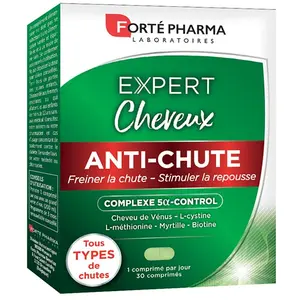 Forté Pharma Expert Anti Chute de cheveux Biotine Vitamine E 30 comprimésExpert Cheveux Anti-Chute a été spécifiquement élaboré pour cibler les causes responsables de la chute des cheveux (origine hormonale, héréditaire, due au stress...). Sa formule réunit des actifs qui agissent en synergie (biotine, niacine, cheveu de Vénus, ortie...) hautement dosée agit en deux temps pour aider à : Freiner la chute(1) : Le COMPLEXE 5α-CONTROL®, trio synergique du Cheveu de Vénus, Palmier nain, et Grande Ortie, agit sur la 5α-réductase, enzyme responsable de la chute capillaire. Stimuler la repousse(3) : Enrichie en L-cystine et L-méthionine, deux acides aminés, la formule agit au cœur de la fibre capillaire pour une production optimale de kératine, principal constituant du cheveu. Son action est optimisée par la présence de Biotine(2) et de Myrtille qui favorise la microcirculation au niveau du bulbe capillaire(3). Expert Cheveux Anti-Chute protège aussi vos cheveux du stress oxydatif(4) grâce à la Vitamine E contenue dans la formule. Votre chevelure est nourrie et protégée de l’intérieur. Elle retrouve toute sa force et sa densité, notamment grâce à une formule complète à la biotine, niacine, et cheveu de Vénus. (1) Le Cheveu de Vénus aide à prévenir la perte de cheveux. (2) La vitamine B8 (biotine) contribue au maintien de cheveux normaux.(3) La Myrtille active la microcirculation du cuir chevelu. (4) La vitamine E contribue à protéger les cellules contre le stress oxydatif.(5) La vitamine B6 contribue au fonctionnement normal du système nerveux, à réduire la fatigue et à réguler l'activité hormonale. Etude d'usage - mars 2023 - 60 femmes - 3 mois.