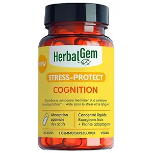 Herbalgem Gemmocaps® Stress-Protect cognition Mémoire concentration 30CapsulesDans un rythme de vie soutenu, notre organisme peut avoir besoin de soutien pour retrouver équilibre et sérénité. HerbalGem a développé une gamme dédiée, GEMMOCAPS STRESS PROTECT. Une synergie innovante alliant les bienfaits des bourgeons frais issus de l’agriculture biologique à des plantes reconnues pour leur action adaptogène*.Ces formules 100% d’origine végétale, accompagnent l’organisme dans sa capacité à faire face au stress du quotidien, en prenant en compte les besoins spécifiques de chacun. *Les plantes adaptogènes sont traditionnellement utilisées pour aider l’organisme à mieux s’adapter aux situations de stress.GEMMOCAPS® STRESS-PROTECT COGNITION : le geste simple et une protection naturelle pour rester concentré(e) et alerte jour après jour.