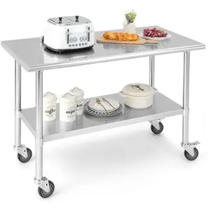 Étagère inférieure réglable pour ranger des articles de différentes hauteurs 4 roues pivotantes (2 verrouillables) pour un déplacement et une fixation faciles Les bords et les coins sont arrondis pour plus de sécurité Construit en acier inoxydable et en acier galvanisé pour une longue durée de vie Dimensions : 122x61x89 cm Capacité de poids du plateau de table : 150 kg Capacité de poids de létagère : 100 kg