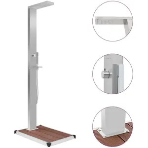Ons multifunctionele douchepaneelsysteem heeft een stijlvol ontwerp. In combinatie met een strakke douchebak vormt het een geweldige aanvulling op je zwembad of andere buitenruimte. De douchetoren is gemaakt van duurzaam roestvrij staal met een geborstelde afwerking en heeft een mooi, gebogen ontwerp. Hij heeft een regendouche, watervaldouche, massagedouche en handdouche. De gewenste functie kan eenvoudig geselecteerd worden met een knop. Dompel jezelf onder in een echt ontspannende douche-ervaring en geniet van de moderne stijl van dit prachtig ontworpen douchepaneelsysteem! Onze douchebak biedt het hoogste niveau van hygiënebescherming, met duurzaamheid en corrosiebestendigheid. De tuindouchebak is eenvoudig te reinigen met een vochtige doek. Bovendien zijn de bevestigingsgaten voorgeboord voor een eenvoudige installatie. Het douchepaneelsysteem is eenvoudig te monteren. Bevestigingsaccessoires zijn ook bij de levering inbegrepen. Douche: Kleur: zilver Materiaal paneel: 201 roestvrij staal met een geborstelde afwerking Totale hoogte: 210 cm Afmetingen kolom: 15 x 6,5 cm (L x B) Afmetingen basis: 20 x 12 cm (L x B) Afmeting regendouche: 23 x 14 cm (L x B) Breedte waterval: 12,5 cm Afmetingen massagejets: 20,5 x 10,8 cm (L x B) Afmetingen douchekop: 2,8 x 2,8 x 21 cm (B x D x H) Lengte roestvrijstalen slang: 150 cm Functies: regendouche, watervaldouche, massagedouche en handdouche 100 siliconen spuitmondjes (50 spuitmondjes op de regendouche en 50 op de massagejets) De silliconen spuitmondjes zijn bestand tegen kalkopbouw Levering bevat montageaccessoires Standaard 1/2 inch verbindingsstuk Douchebak: Kleur: bruin en zilver Materiaal: HKC en roestvrij staal met een geborstelde afwerking Totale afmetingen: 80 x 62 x 5 cm (B x D x D) Met gelat ontwerp Voor gebruik door 1 persoon Bevestigingsgaten zijn voorgeboord Montage vereist Levering bevat: 1 x douchepaneel (1 regenvaldouche en 1 handdouche) 1 x douchebak Montageaccessoires