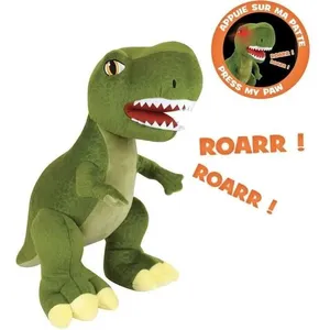 Cette peluche dinosaure +/- 32 cm est une parfaite représentation du T-REX par Une simple pression sur son bras il poussera des cris terrifiants et ses yeux sillumineront pour le plaisir de votre petit aventurier. Votre enfant sera ravi de posséder cette peluche entièrement issue de bouteilles plastiques recyclées.