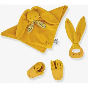 KALOO Lapinoo K218011 - Kit de naissance - Couleur ocre - 3 articles pour bébé - Doudou + anneau de dentition + chaussures pour bébé 11 cm - Dès la naissance