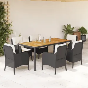 Cet ensemble de salle à manger de jardin est un excellent choix pour les repas en plein air ou pour vous détendre dans le jardin, l'arrière-cour ou le patio. Matériau durable : la résine tressée, également connue sous le nom de poly rotin, est un matériau synthétique solide et nécessitant peu d'entretien qui ressemble au rotin naturel. Il est léger, facile à nettoyer et couramment utilisé pour les meubles d'extérieur en raison de sa durabilité et de ses propriétés de résistance aux intempéries.Expérience d'assise confortable : ce mobilier d'extérieur, doté de coussins épais, offre une expérience d'assise confortable.Housse amovible et lavable : ces coussins de siège sont dotés de housses amovibles pour un lavage et un entretien faciles. Les housses de coussin de chaise ont un rabat à l'arrière pour une fixation facile aux chaises.Dessus stable et facile à nettoyer : cette table de jardin a un dessus en bois d'acacia robuste, durable et facile à nettoyer avec un chiffon humide.Cadre robuste et stable : le cadre en acier enduit de poudre assure la solidité et la stabilité du meuble de jardin pour une utilisation quotidienne à l'extérieur. Bon à savoir :Pour que vos meubles d'extérieur restent beaux, nous vous recommandons de les protéger avec une housse imperméable. En-tête / Fabricant=vidaXL;Perception sensorielle / Coloris (générique)=Noir;Titre=vidaXL Ensemble à manger de jardin coussins 7pcs Noir Résine tressée