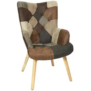 Fauteuil patchwork marron HOME DECO FACTORY dimensions H100 x L65 x P74 cm avec pieds en bois brut idéal pour une assise décorative et confortable.