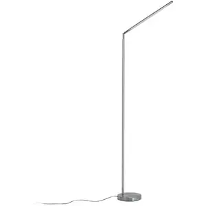 Smalle LED vloerlamp Jabbo met ronde voet en matnikkel afwerking Jabbo lijkt het toppunt van een minimalistische ontwerpstijl en daarom past de LED vloerlamp perfect bij een moderne woonstijl die het motto volgt dat minder meer is. De smalle staaf, die dienst doet als de lampkop, is met een scharnier bevestigd aan de rest van het frame en kan daarom omhoog en omlaag worden bewogen. De schakelkop bevindt zich ook op deze hoogte, namelijk aan het uiteinde van de lampenkop - op het eerste gezicht nauwelijks als zodanig herkenbaar. Jabbo kan met een simpele druk worden in- of uitgeschakeld en het wordt al snel duidelijk dat de focus hier minder ligt op gezellige accentverlichting en meer op het creëren van functioneel, gericht licht dat de ogen ontlast bij het lezen en ook nuttig is voor andere taken in huis.