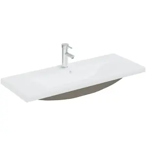 Deze inbouwwasbak is een chique en tijdloze aanvulling op elke badkamer, toilet, enz. De gootsteen dient niet alleen als product voor dagelijks gebruik, maar hij is ook een versiering voor je leefruimte. Dankzij zijn trendy en eigentijdse ontwerp past deze wastafel in elk interieur. De wastafel is gemaakt van keramiek en is dus zeer eenvoudig schoon te maken. Een overloop zorgt ervoor dat er water uit het basin stroomt als deze te vol dreigt te raken. Het geglazuurde oppervlak geeft de wasbak een modern en elegant tintje. Een kraan en pop-up afvoer met overloopfunctie zijn inbegrepen. De kraan is een mengkraan. Als je warm water nodig hebt, dan moet er een boiler zijn aangesloten. Kleur: wit Materiaal: keramiek Afmetingen wastafel: 101 x 39 x 18 cm (L x B x H) Dikte keramieken rand: 4 cm Diameter afvoergat: 4,5 cm Met een overloop Met kraan Pop-up-afvoer met overloopfunctie Kinderen moeten onder toezicht staan, om te verzekeren dat ze niet met het apparaat spelen. Houd kinderen uit de buurt van het montagegebied. Let op: lees vóór gebruik zorgvuldig de instructies en bewaar ze voor toekomstig gebruik.