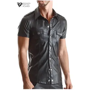 Een prachtig klassiek shirt met een militaire snit, echter.... Bij nadere inspectie zien we wat mode-inspiratie voor dit product. er zijn ook weinig visuele smaken en oplossingen die liefhebbers van de wereld van fetisjkleding zullen waarderen. Lange verticale stiksels aan de voor en achterkant slanken het figuur optisch af. Het shirt heeft een Slim-Fit snit die het figuur in de taille optisch slanker maakt en de borst effectief blootlegt.Metalen decoratieve drukknopen bij zakken epauletten en aan de voorkant over de gehele lengte zijn ook opmerkelijk. Volledig gemaakt van hoogwaardig zwart en elastische wetlook materiaal.De karakteristieke rode alcantara patch met het RFP-logo en puntrode stiksels.