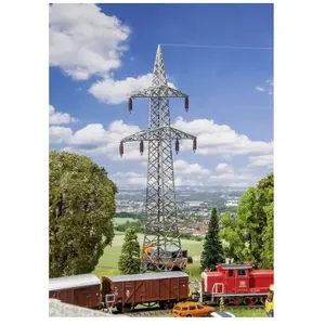 Lot de pylônes composé de deux pylônes quatre triangles identiques en acier avec une traverse inférieure plus large et une traverse supérieure plus étroite sur lesquelles on peut fixer des isolateurs debout ou suspendus. Construction sous forme de variante à un niveau possible. Câble conducteur assurant le transport du courant fourni (sans fonction). Ce kit de montage contient: 172 pièces détachées dans 3 couleurs et 1 notice de montage. Age minimum : 15 ans En-tête / Fabricant=Faller;Tranche de poids=250 à 500 g;Titre=Modélisme HO : 2 Pylônes de câbles aériens (110 kV)