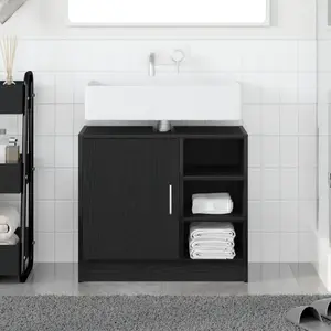 Ce meuble sous lavabo en chêne noir allie style contemporain et fonctionnalité. Avec ses dimensions de 63x29x55 cm il offre un rangement optimal grâce à une porte et trois étagères. Fabriqué en bois dingénierie robuste il est durable et facile à entretenir parfait pour votre salle de bain.