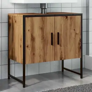 Deze wastafelkast is een perfecte aanvulling op je badkamer! Hij geeft je badkamer een nette en opvallende uitstraling! Stevige constructie: het gepoedercoate staal en het bewerkte hout bieden een stevige constructie, waardoor je spullen goed ondersteund worden. Voldoende opbergruimte: de wastafelkast biedt voldoende ruimte om toiletartikelen en badspullen, zoals zeep, shampoo en tandpasta, op te bergen. Ruimtebesparend ontwerp: de bovenkant van de badkamerkast is ideaal voor het plaatsen van de wastafel, zodat je de vrije ruimte onder de wastafel volledig kunt benutten. Verstelbare poten: De gootsteenkast is uitgerust met verstelbare levellers, waarmee u de hoogte kunt aanpassen en stabiliteit op oneffen vloeren kunt garanderen. Waarschuwing: Om kantelen te voorkomen moet dit product met de bijgeleverde bevestigingsmaterialen aan de muur gemonteerd worden. Kleur: artisan eiken Materiaal: bewerkt hout en gepoedercoat staal Afmetingen: 60 x 33 x 60 cm (L x B x H) Afmeting sifonopening: 8 x 20 cm (L x B) Montage vereist: ja
