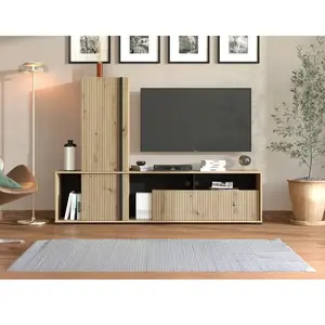 Mur TV avec 3 portes et 3 niches - Naturel clair et noir - BELUTZY