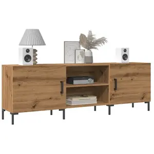Ce meuble de télévision robuste est certainement conçu pour être un point de mire de votre pièce avec un design tendance mais pratique. Matériau robuste : le bois d'ingénierie est d'une qualité exceptionnelle avec une surface lisse et présente également résistance, stabilité et résistance à l'humidité. Fabriqué en bois d'ingénierie, le meuble TV est facile à nettoyer.Rangement spacieux : l'unité TV dispose de 4 compartiments qui en font un endroit idéal pour ranger tous vos magazines, DVD et autres objets.Fonction d'affichage : le dessus robuste de l'armoire multimédia est idéal pour exposer des objets décoratifs tels que des cadres photo et des plantes.Porte pratique : gardez vos essentiels à l'abri de la poussière en les cachant derrière la porte de l’unité multimédia.Pieds en fer : les pieds en fer ajoutent un style calme à votre intérieur tout en assurant sa stabilité. Attention :Pour éviter qu'il ne bascule, ce produit doit être utilisé avec le dispositif de fixation murale fourni. Couleur : chêne artisanal Matériau : bois d'ingénierie, fer Dimensions : 150 x 30 x 50 cm (l x P x H) Assemblage requis : oui