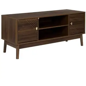 Meuble TV 2 portes 2 niches en bois et MDF pieds en pin teinté chêne foncé de la gamme Colette. Le relief original et la teinte foncée chaleureuse de ce meuble rétro combine à merveille esthétisme et praticité.Son design orné de reliefs géométriques en diagonale offre une texture visuellement captivante les poignées dorées discrètes mais élégantes ajoutent une touche de sophistication à lensemble.