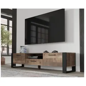 Ce meuble TV élégant NUKA incarne le style et la modernité devenant un élément indispensable du salon. Son charme repose principalement sur ses impressionnantes jambes noires en forme de cadre qui contrastent avec le reste du meuble et lui confèrent un caractère unique. Avec trois compartiments fermés – deux latéraux et un central – ainsi qu’une étagère ouverte il offre un espace idéal pour ranger divers accessoires y compris les décodeurs ou les consoles. De plus les poignées noires du système box s’intègrent parfaitement à l’ensemble soulignant l’élégance du meuble. Les pieds distinctifs renforcés par un support central supplémentaire garantissent la stabilité et la solidité de la construction. Le meuble est également équipé d’un passe-câbles ce qui le rend non seulement esthétique mais aussi fonctionnel et pratique. Description : Pieds caractéristiques assurant une grande stabilité (support central supplémentaire) Trois compartiments fermés (deux latéraux et un central) Une étagère ouverte Ouverture pour le passage des câbles Poignées noires du système box Matériaux utilisés : Corps : panneau laminé 16 mm chants ABS 05 mm Façades : panneau laminé 16 mm Pieds : panneau laminé 16 mm Coloris : Corps : chêne grange Façades : chêne grange Pieds : noir Dimensions : Largeur : 200 cm Profondeur : 43 cm Hauteur : 48 cm