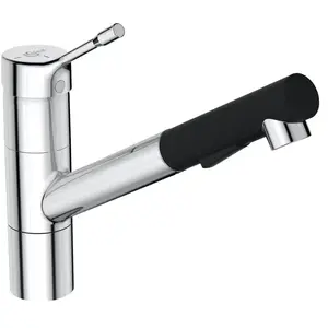 Mitigeur de cuisine CERALOOK (BC297AA) de la marque Ideal Standard Bec tube orientable _x000D_et zone de rotation à 180°_x000D_ Confort : douchette extractible noire mat avec 2 jets : jet pluie et jet brume Economies dénergie : cartouche Firmaflow® Ø 38 mm avec limiteur de température Economies deau : limiteur de débit à 50% déverrouillable Durabilité renforcée : flexibles IdealFlex anti-torsions et anti-rayures 2