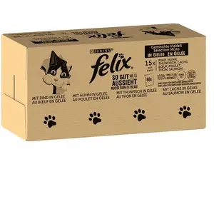Felix Elke Dag Feest Mix selectie in Gelei Kattenvoer Natvoer in de smaken Zalm, Tonijn, Rund en Kip FELIX Elke Dag Feest is een assortiment onweerstaanbare maaltijden die er zó lekker uitzien, zó lekker ruiken en zó lekker smaken alsof je het zelf hebt klaargemaakt! Speciaal bereid met zachte stukjes in een overheerlijke gelei. Jouw deugniet zal elke keer weer genieten van een onweerstaanbare maaltijd. Geen toegevoegde kunstmatige smaakstoffen of conserveringsmiddelen 100% volledig en gebalanceerd Vitamine D & E Bron van omega 6-vetzuren