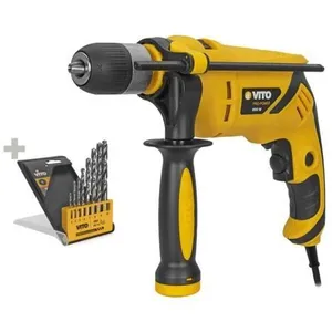 Perceuse à percussion VITO puissance 850W + coffret forêts 8 pièces acier Perceuse 2 fonctions: vissage et perçage. Vitesse de rotation de 3000 tr/min. Mandrin auto serrant de 13mm. Fonction réversible. Perce le bois jusquà 30mm le béton jusquà 20mm et le métal jusquà 13mm. Coffret forêts 8 pièces diamètre 3 à 10 mm Acier . Poids : 2.1 Kg