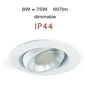 Description générale Ce spot LED encastrable rond orientable de 8 watts est conçu pour une utilisation dans des environnements humides, tel que les salles de bains, cuisines, bars et restaurants. Avec un design moderne, il remplace efficacement les anciens spots dichroïques de 75 watts tout en offrant une lumière chaude de 3000K. Son installation est simple grâce à son branchement direct sur 230V et il s'intègre parfaitement dans les faux plafonds en plaques de plâtre. Spécifications techniques Puissance : 8W Couleur de la lumière : 3000K (lumière chaude) Flux lumineux : 660LM Angle d'ouverture : 90 degrés Dimensions : h50 x ø90mm Découpe : 66mm Indice de protection : IP44 Compatibilité et accessoires Remplace les anciens spots dichroïques de 75W Compatible avec les faux plafonds en plaques de plâtre Installation Branchement direct sur 230V Installation dans un trou de découpe de 66mm Utilisation Idéal pour les salles de bains, cuisines, toilettes publiques, bars et restaurants