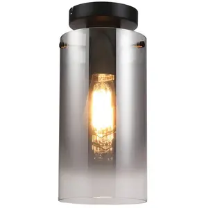 Verlichting met rook (smoke) glas is helemaal van deze tijd. Het glas van deze plafondlamp heeft 2 gezichten: spiegelend chroom als de lamp uit is en grijs kleurig (smoke) als de lamp brandt. De kleur is aflopend en loopt over van rook naar helder aan het uiteinde. De hoogte van deze plafondlamp is 33 cm. Het glas zelf heeft een hoogte van 28 cm en de breedte is 15 cm. De zwarte plafondplaat heeft een doorsnede van 11 cm en valt helemaal over het lichtpunt heen. Dit armatuur is geschikt voor een lichtbron van maximaal 40 Watt E27 (excl.). Kleur: mat-zwart metaal en voorzien van rook kleurig glas.