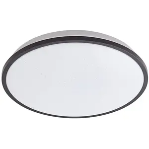 Glane ronde LED plafondlamp met stereffect, IP44 De kap van de Glane LED plafondlamp zit in een smalle, zwarte ring en is afgewerkt met een stereffect zodat deze mooi fonkelt als de lamp aan is en tegelijkertijd het licht gelijkmatig de kamer in laat schijnen. De platte, vrij grote lamp heeft een beschermingsgraad van IP44 en is daarom geschikt voor gebruik in badkamers en andere vochtige ruimtes, maar ook voor vele andere ruimtes. De lamp geeft warmwit licht.