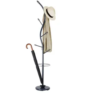 Porte-manteaux TRIANA portant à vêtements sur pied en forme darbre avec 6 crochets et un porte parapluie métal laqué gris et bois