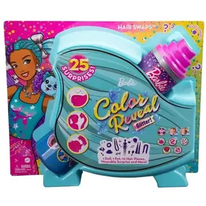 Deze Barbie® Color Reveal™ glitter! Hair Swaps™-poppen bieden de ultieme unboxing-ervaring met 25 verrassingen -- open het voorpaneel om 15 mysteriezakjes te vinden met daarin verrassingen en een op haarspray geïnspireerde Barbie® Color Reveal™-tube! Haal de Barbie® Color Reveal™-pop bedekt met glitterpaars uit de tube, vul de tube met warm water, plaats de pop erin en draai haar rond. Het water verandert van kleur met glinsterende glitters die rondzweven voor een magisch effect. Wanneer de pop wordt uitgetrokken, worden haar gelaatstrekken onthuld! Extra verrassingen zijn 10 haarstukken, een huisdiervriendje, mode, accessoires, een discobal met confetti en meer. Speel verschillende kapseltransformaties na met Barbie®-pop en haar huisdiervriendje met behulp van de plug-in haarstukken. Maak een look en verwissel het dan. Zoveel coole kapsels om te proberen! En de verrassingen gaan door... gebruik ijskoud water om de kleurveranderingsfuncties te activeren, zoals op de lippen en ogen van de Barbie®-pop en het gezicht van het huisdier. Met het gebruik van warm en ijskoud water kunnen kinderen de wow-kleurwisselmomenten keer op keer herhalen! Elk afzonderlijk verkrijgbaar, afhankelijk van beschikbaarheid. Poppen kunnen niet op zichzelf staan. Kleuren en decoraties kunnen variëren. Producteigenschappen: Met 25 verrassingen in één pakket, Barbie® Color Reveal™ Glitter! Hair Swaps™-poppen leveren de ultieme unboxing-ervaring met een glitter-onthulling en 10 verschillende plug-in haarstukken die kunnen worden gemengd en gecombineerd om het helemaal over het haar te maken! Kinderen pakken deze meerdelige set uit door de buitenste laag van de verpakking te openen en 15 mysteriezakjes en een op haarspray geïnspireerde tube te vinden - verwijder de dop van de verpakking en zoek een scrunchie op kinderformaat! Schroef de bovenkant van de tube los en trek er een pop uit die van top tot teen bedekt is met Color Reveal™ paarse glitter! Blijf uitpakken om een huisdiervriend en 10 ...