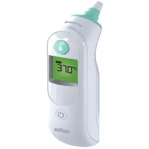 Braun IRT6515MNLA ThermoScan 6 koortsthermometer Snel en gebruiksvriendelijk Het meest gebruikte en aanbevolen merk thermometer onder artsen Display met kleurcodes voor moeiteloze interpretatie van metingen Sonde met brede hoek voor nauwkeurige metingen, ook bij pasgeboren baby's Gepatenteerde voorverwarmde punt met een temperatuur tot 34 °C voor zacht meten en een professionele nauwkeurigheid ExacTemp-technologie Display met achtergrondverlichting voor gebruik in het donker Gebruik de Braun-hygiënecaps voor eenmalig gebruik om kruisbesmetting te voorkomen Kenmerken Soort: Contactthermometer Kleur van het product: Wit, Groen Thermometer locatie: Oor Soort bediening: Knoppen Eenheid van de maatregel: °C Beeldscherm: LCD Backlight display: Ja Compatibele producten: Hygiene caps Energie Type accu/batterij: Ingebouwd Inhoud van de verpakking Gebruikershandleiding: Ja Batterijen meegeleverd: Ja