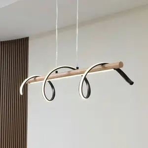 Spiraali LED hanglamp - rustieke flair voor woon- en eetkamer De Spiraali LED hanglamp combineert functionele verlichting met een vleugje landhuis charme. De geïntegreerde LED-lichtbron zorgt voor energiezuinige verlichting die een gezellige sfeer creëert in zowel de woonkamer als de eetkamer. Het zwarte ontwerp, gecombineerd met houten accenten, geeft elke kamer een warme en uitnodigende uitstraling. Met de Spiraali hanglamp wordt licht een designelement dat de sfeer in de kamer op een unieke manier beïnvloedt, waarbij altijd rekening wordt gehouden met het aspect van energiebesparing.