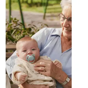 Notre collerette souple prend soin des peaux sensibles. 9 parents sur 10 affirment que leur bébé ne présente plus d'irritations cutanées depuis l'adoption de la sucette ultra-douce.** L'apaisement est toujours à portée de main, peu importe qui prend soin de bébé. Désormais composée à 80 % de matériaux d'origine végétale.*