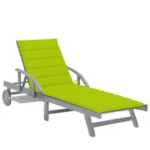 Détendez-vous et reposez-vous dans votre jardin ou patio sur cette confortable chaise longue en bois ! Vous pouvez passer un après-midi de détente dans votre propre espace extérieur. Elle est parfaite pour une piscine, balcon, jardin, etc. Cette chaise longue d'extérieur est fabriquée en bois d’acacia massif avec une finition de couleur grise, ce qui la rend robuste et stable. Le dossier et le repose-pied sont réglables, et vous pouvez verrouiller la chaise longue dans la position souhaitée. Cette chaise longue de jardin peut être facilement déplacée autour de la maison avec 2 roues équipées. Le transat dispose d’une table coulissante pratique, pour placer votre téléphone, lunettes de soleil, boisson et autres petits articles. Le coussin ajoute un confort supplémentaire pendant que vous vous prélassez. Chaque coussin comprend deux jeux de cordes pour que vous puissiez le fixer solidement sur la chaise longue. Remarque : afin de prolonger la durée de vie des meubles d'extérieur, nous vous recommandons de les protéger avec une housse imperméable. Couleur : gris Couleur du coussin : vert vif Matériau : bois d'acacia massif avec une finition grise délavée Matériau du coussin : tissu (100 % polyester) Dimensions : 200 x 68 x 30/86 cm (l x P x H) Dimensions du coussin : 200 x 60 x 3 cm (L x l x é) L'assemblage est requis La livraison contient : 1 x chaise longue 1 x coussin